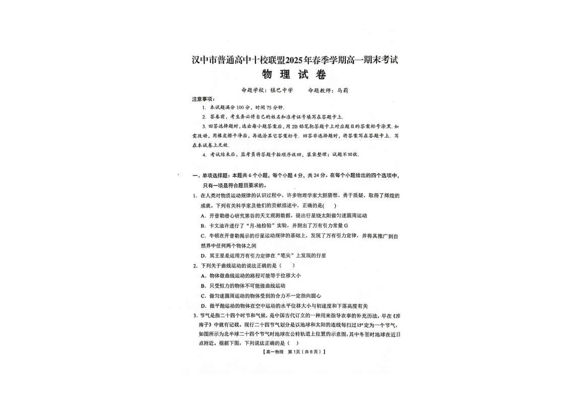 高一物理+答案--陕西省汉中市普通高中十校联盟2024-2025学年高一下学期期末考试