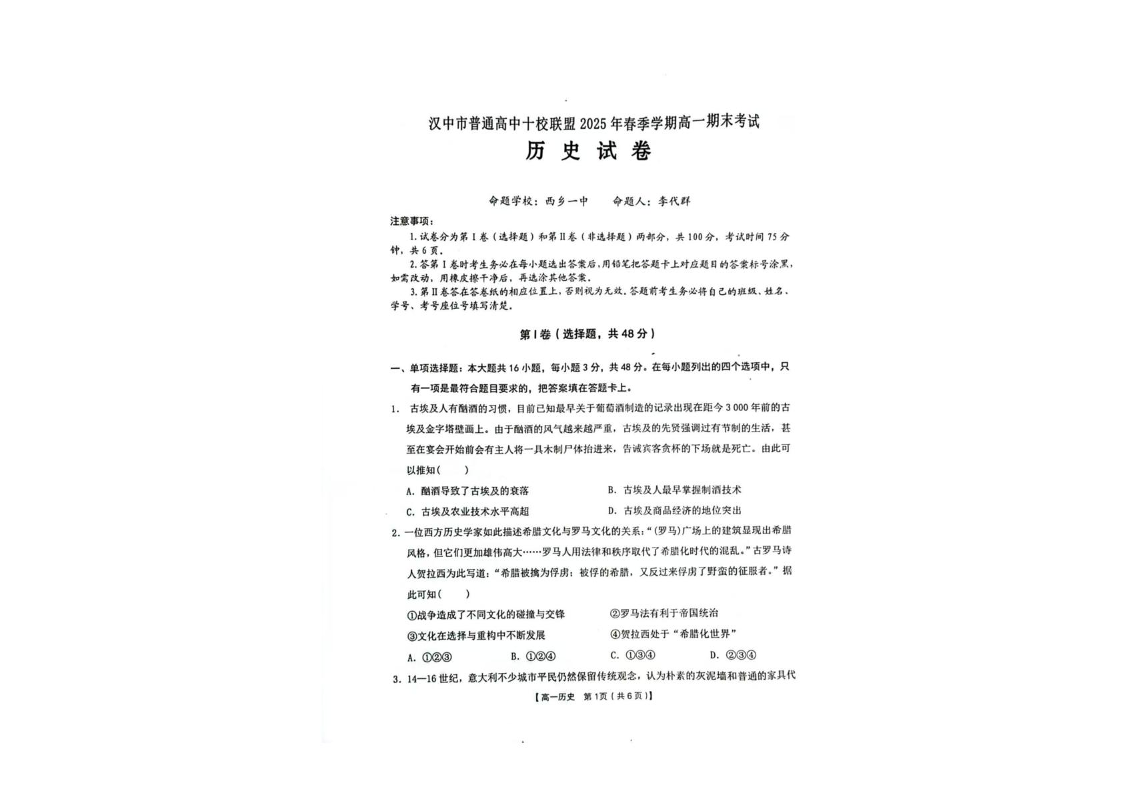 高一历史+答案--陕西省汉中市普通高中十校联盟2024-2025学年高一下学期期末考试