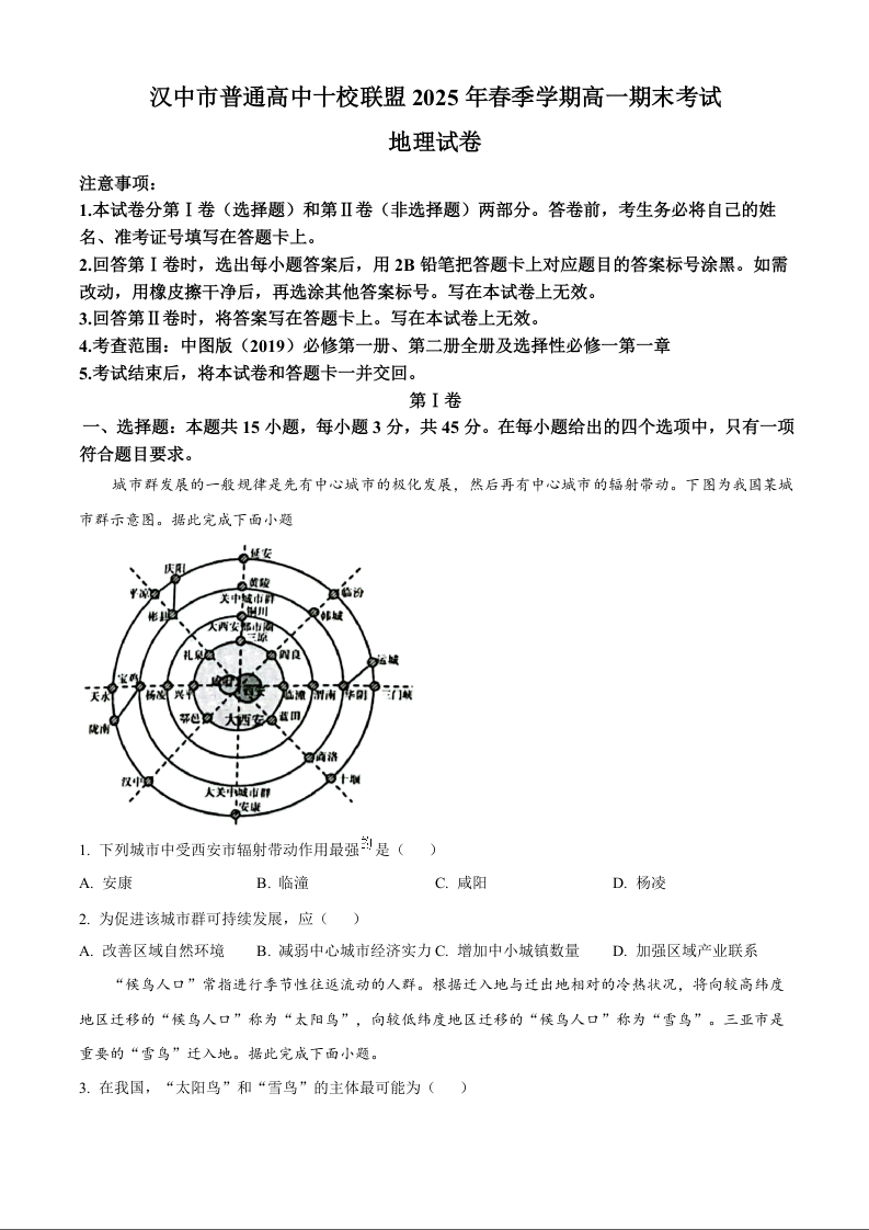 高一地理+答案--陕西省汉中市普通高中十校联盟2024-2025学年高一下学期期末考试