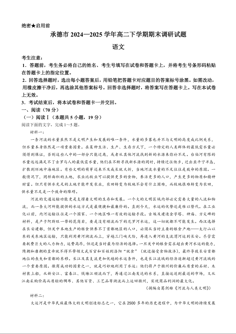 高二语文+答案--河北省承德市2024-2025学年高二下学期期末考试