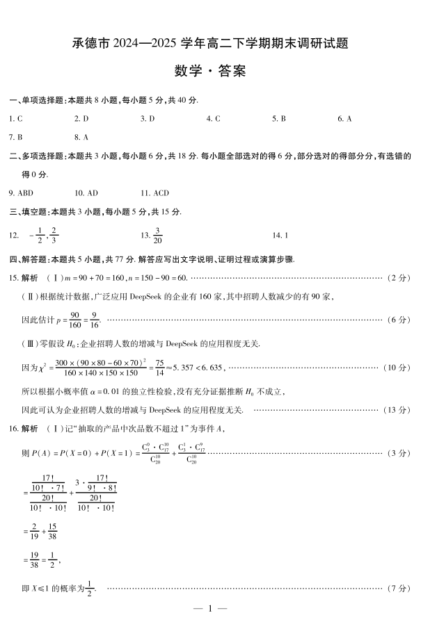 高二数学答案--河北省承德市2024-2025学年高二下学期期末考试