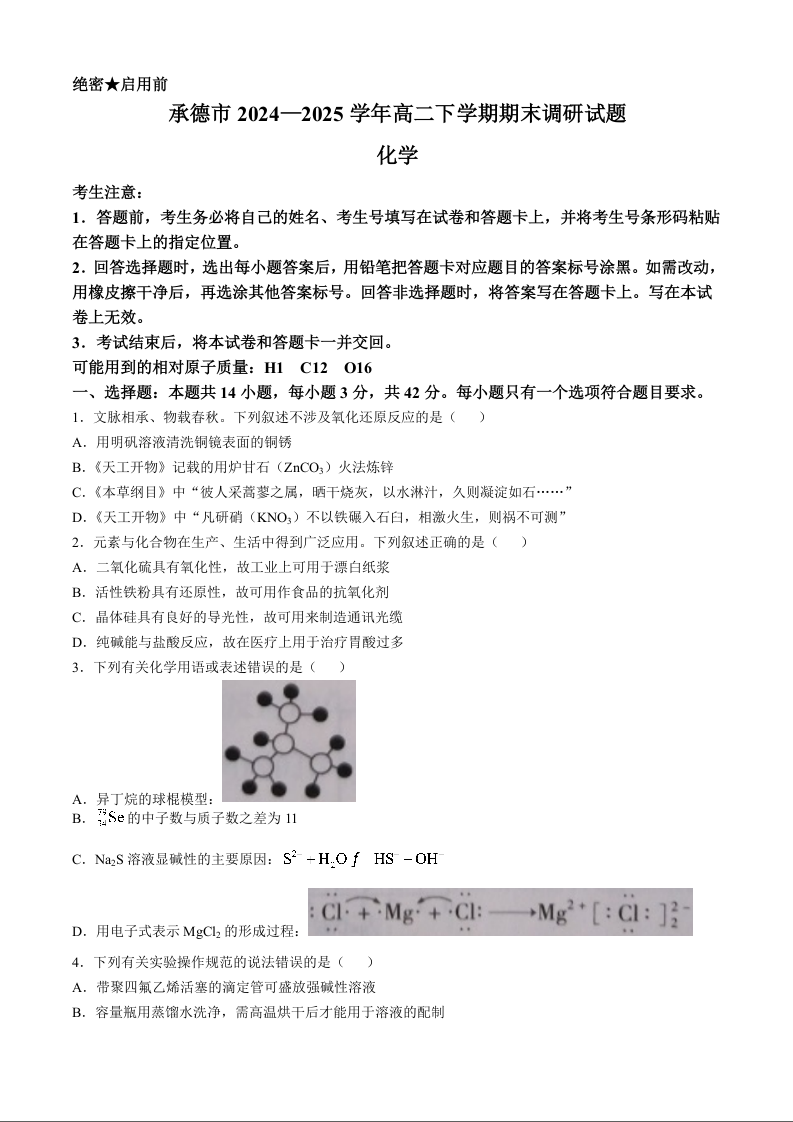 高二化学+答案--河北省承德市2024-2025学年高二下学期期末考试