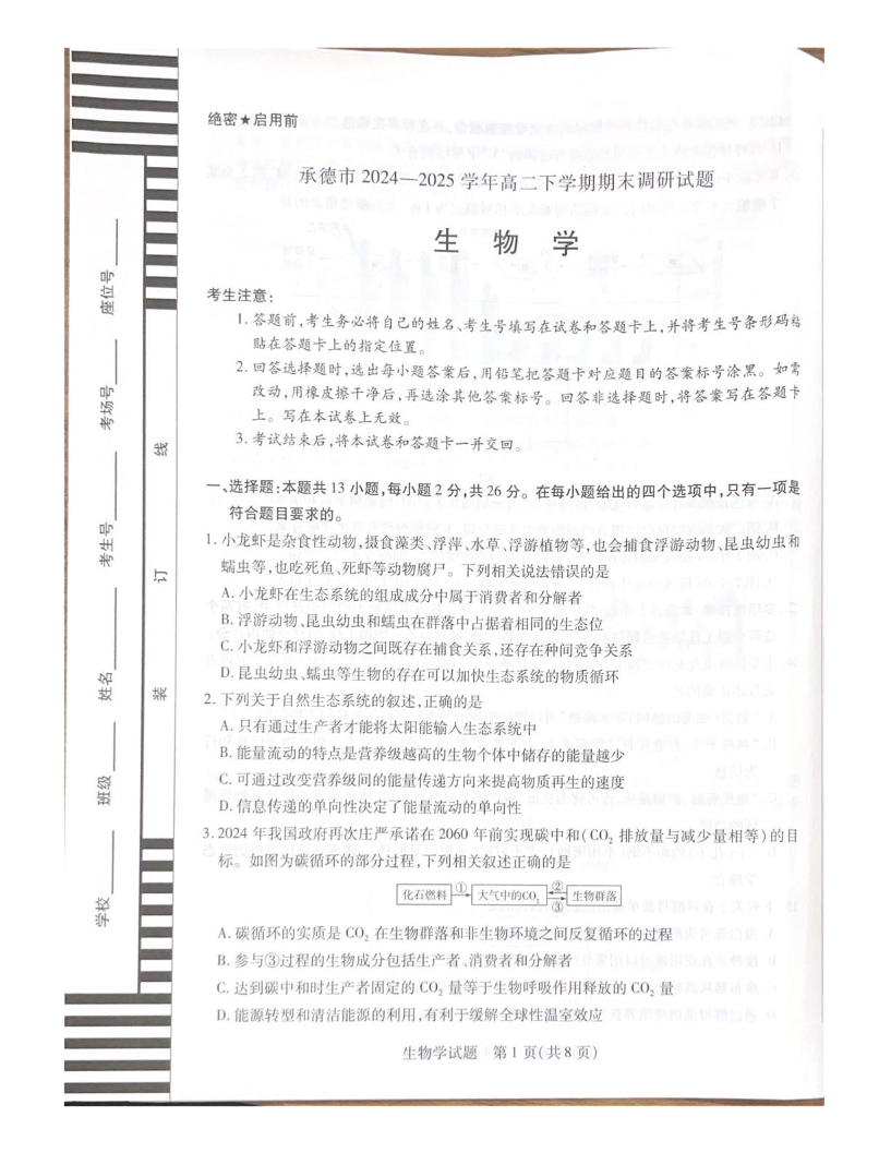 高二生物+答案--河北省承德市2024-2025学年高二下学期期末考试