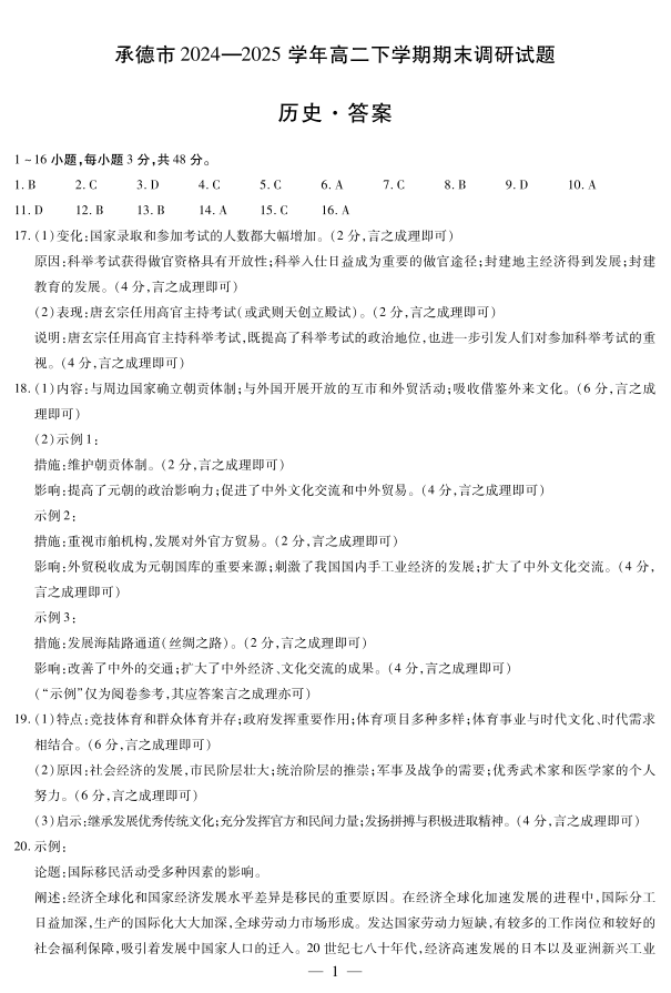 高二历史答案--河北省承德市2024-2025学年高二下学期期末考试