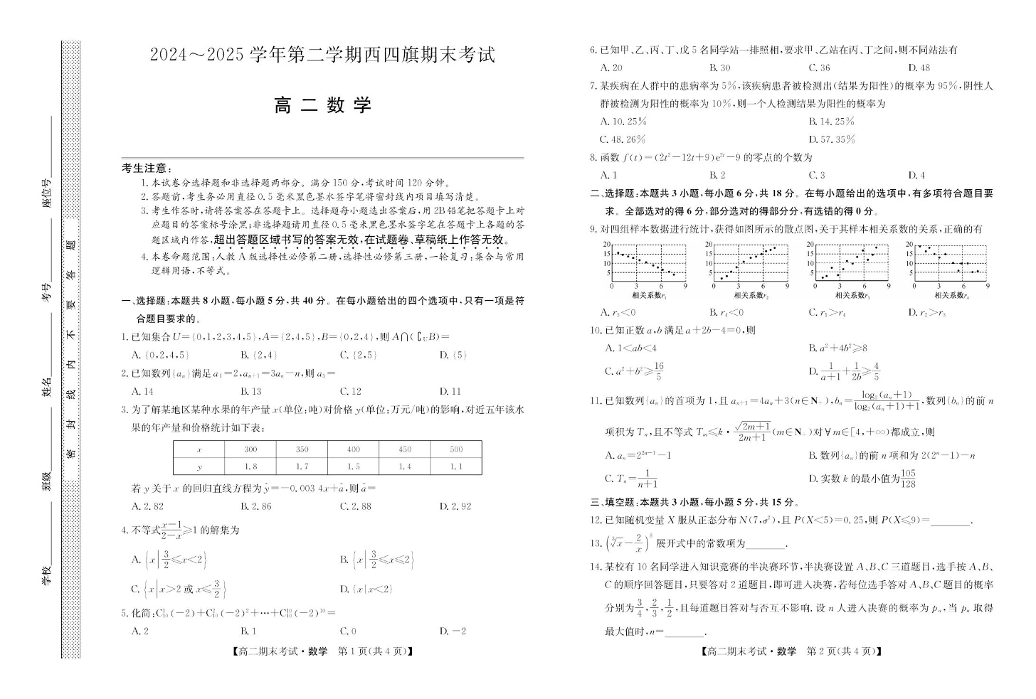 高二数学+答案--内蒙古鄂尔多斯市西四旗2024-2025学年高二下学期期末考试