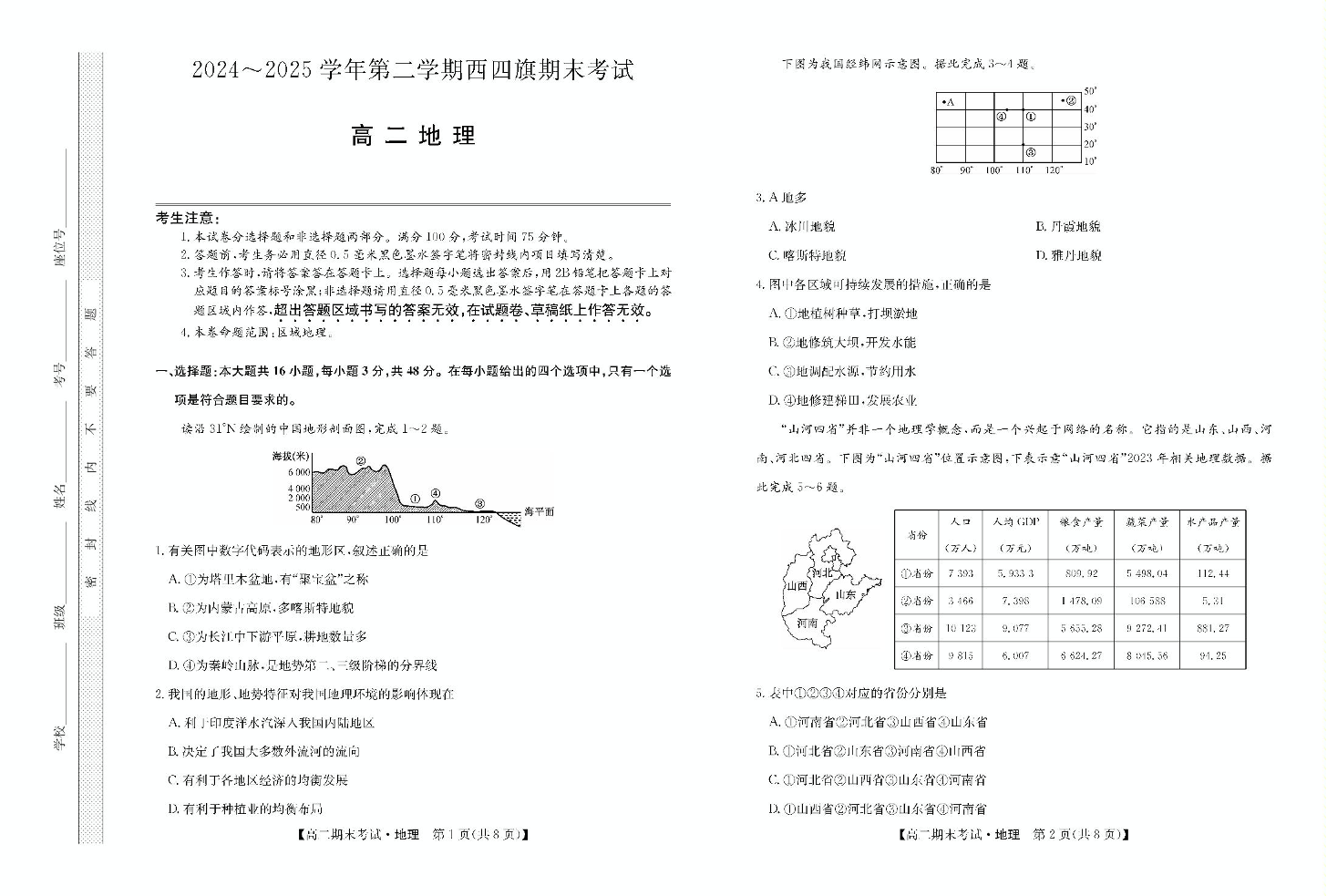 高二地理+答案--内蒙古鄂尔多斯市西四旗2024-2025学年高二下学期期末考试