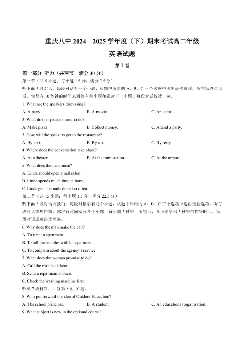 高二英语+答案--重庆市第八中学校2024-2025学年高二下学期期末考试
