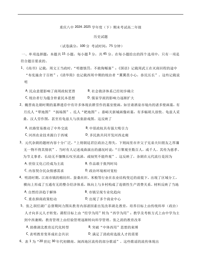 高二历史+答案--重庆市第八中学校2024-2025学年高二下学期期末考试