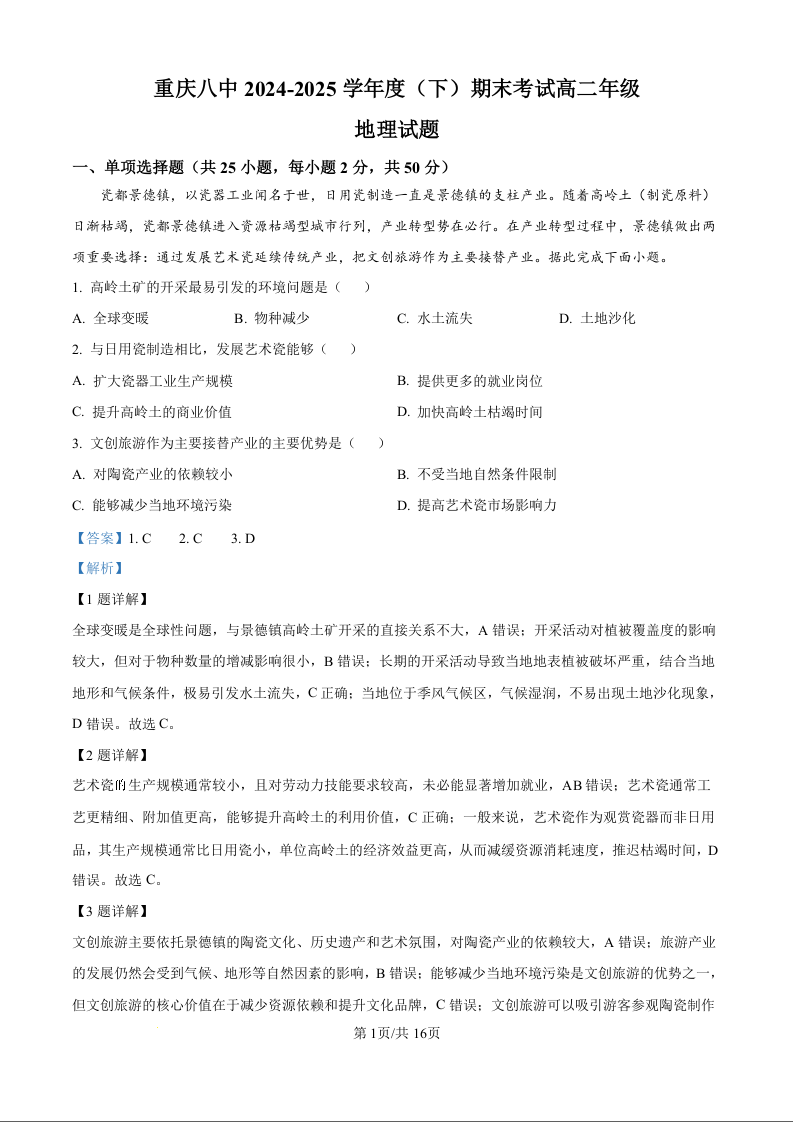 高二地理(精品解析版)--重庆市第八中学校2024-2025学年高二下学期期末考试