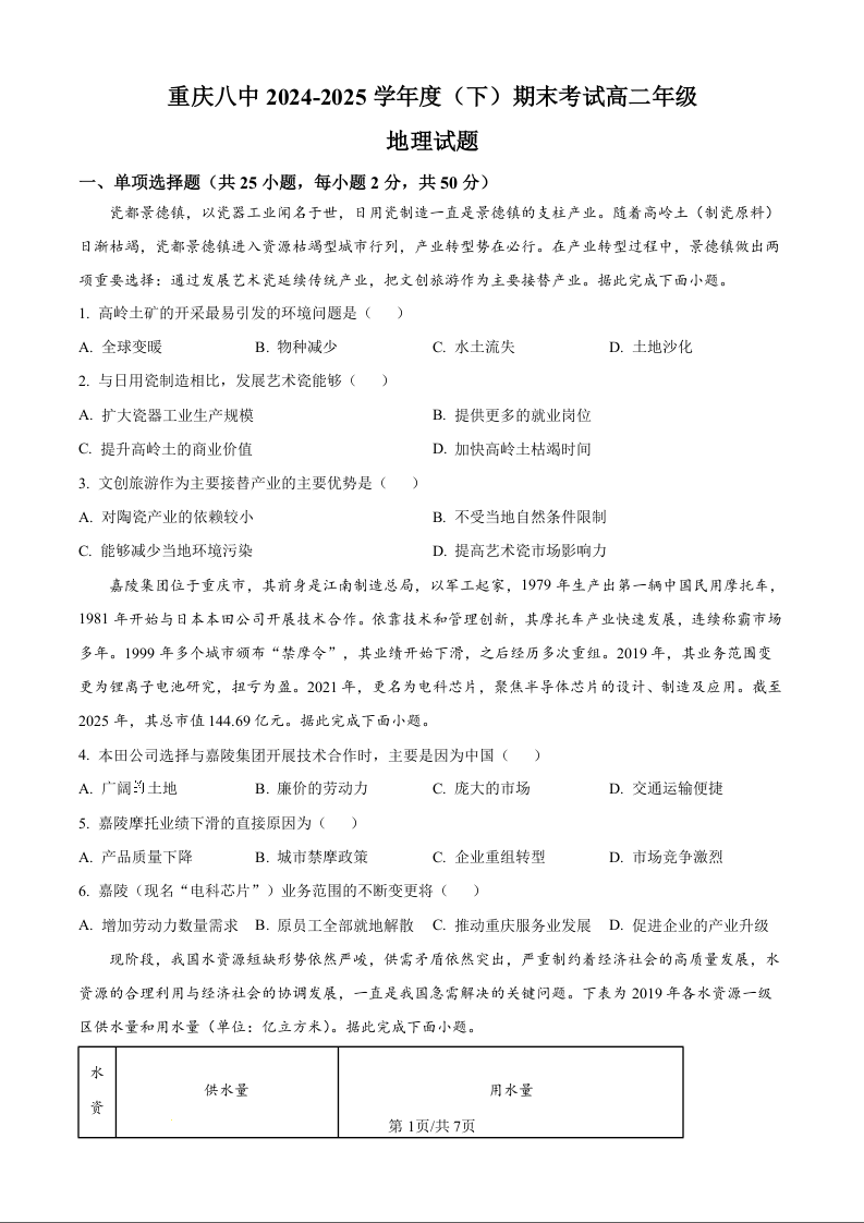 高二地理(原卷版)--重庆市第八中学校2024-2025学年高二下学期期末考试