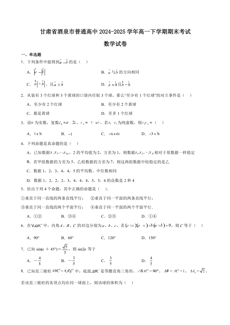 高一数学+答案--甘肃省酒泉市普通高中2024-2025学年高一下学期期末考试