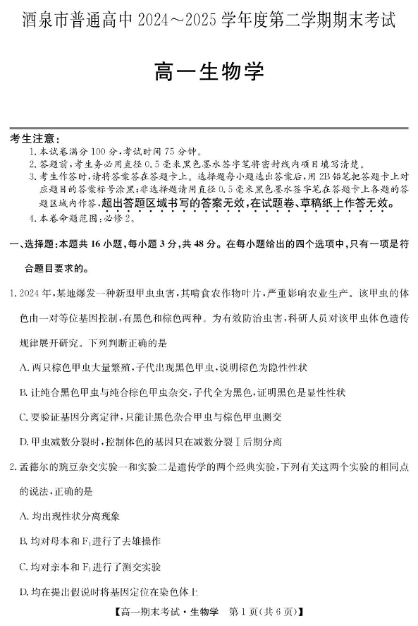 高一生物+答案--甘肃省酒泉市普通高中2024-2025学年高一下学期期末考试
