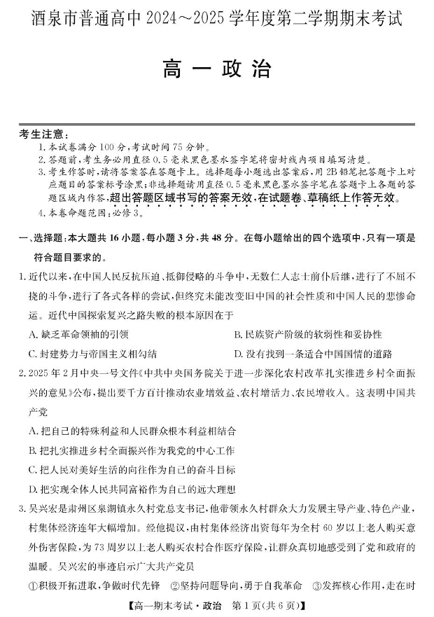 高一政治+答案--甘肃省酒泉市普通高中2024-2025学年高一下学期期末考试