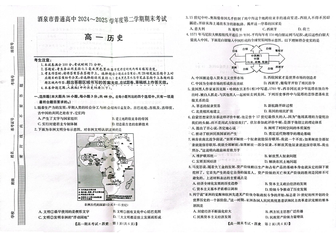 高一历史+答案--甘肃省酒泉市普通高中2024-2025学年高一下学期期末考试