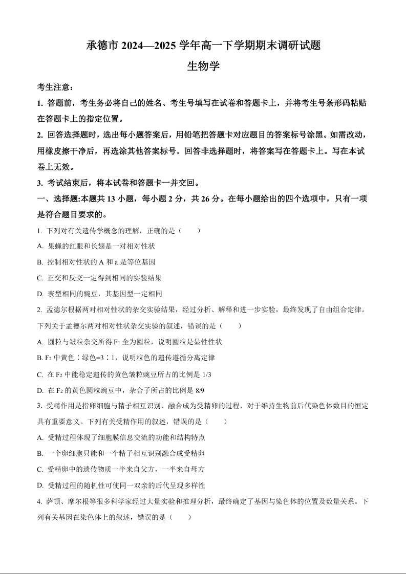 高二生物+答案--河北省承德市2024-2025学年高一下学期期末考试
