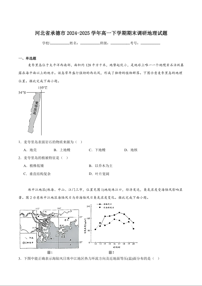 高二地理+答案--河北省承德市2024-2025学年高一下学期期末考试