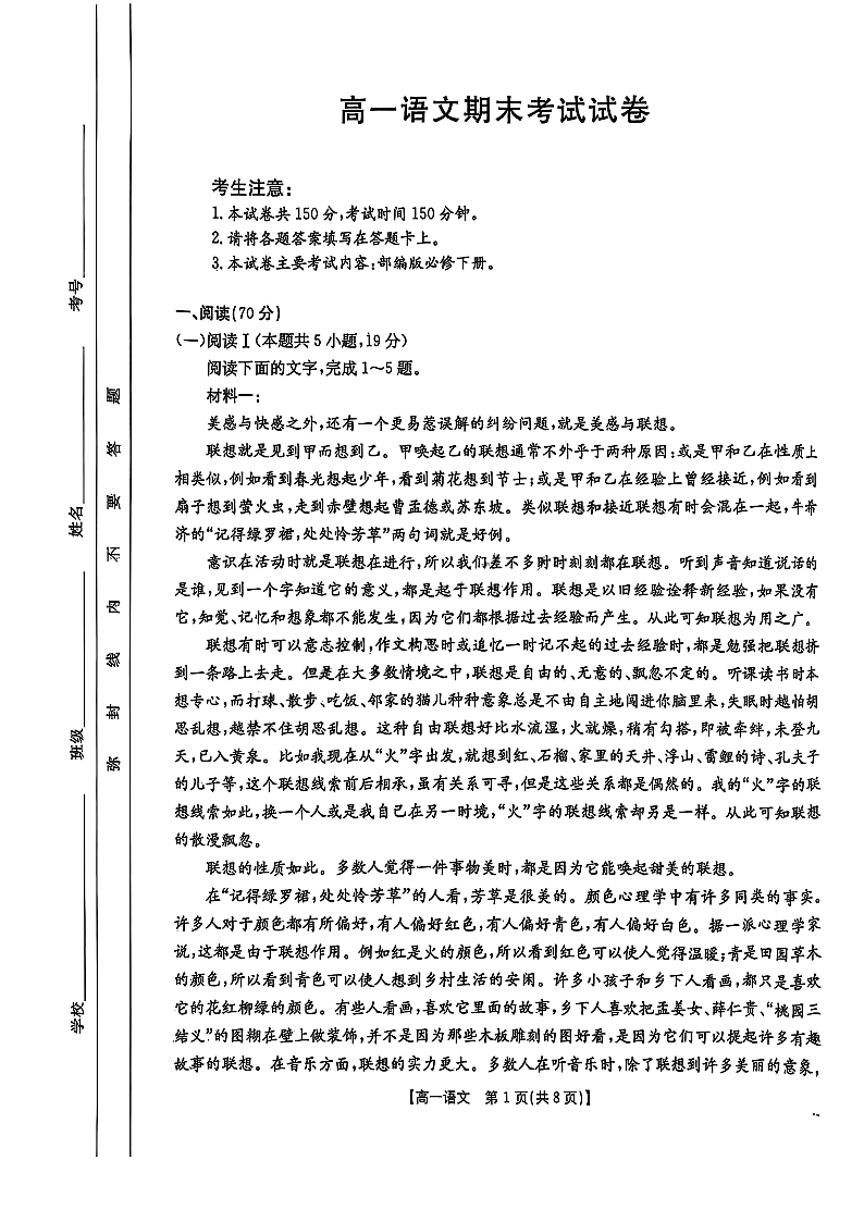 高一语文+答案--吉林省部分学校2024-2025学年高一下学期期末考试