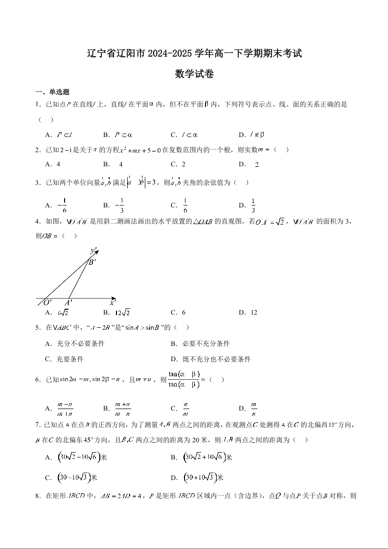 高二数学+答案--辽宁省辽阳市2024-2025学年高一下学期期末考试