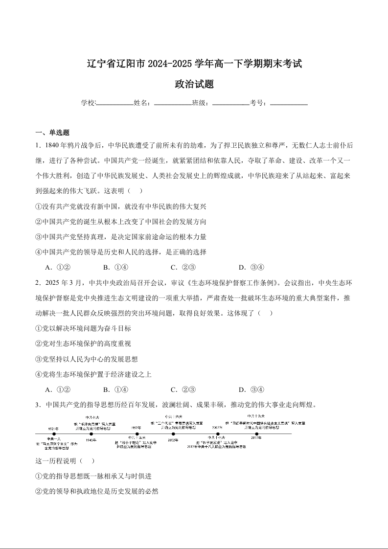 高二政治+答案--辽宁省辽阳市2024-2025学年高一下学期期末考试