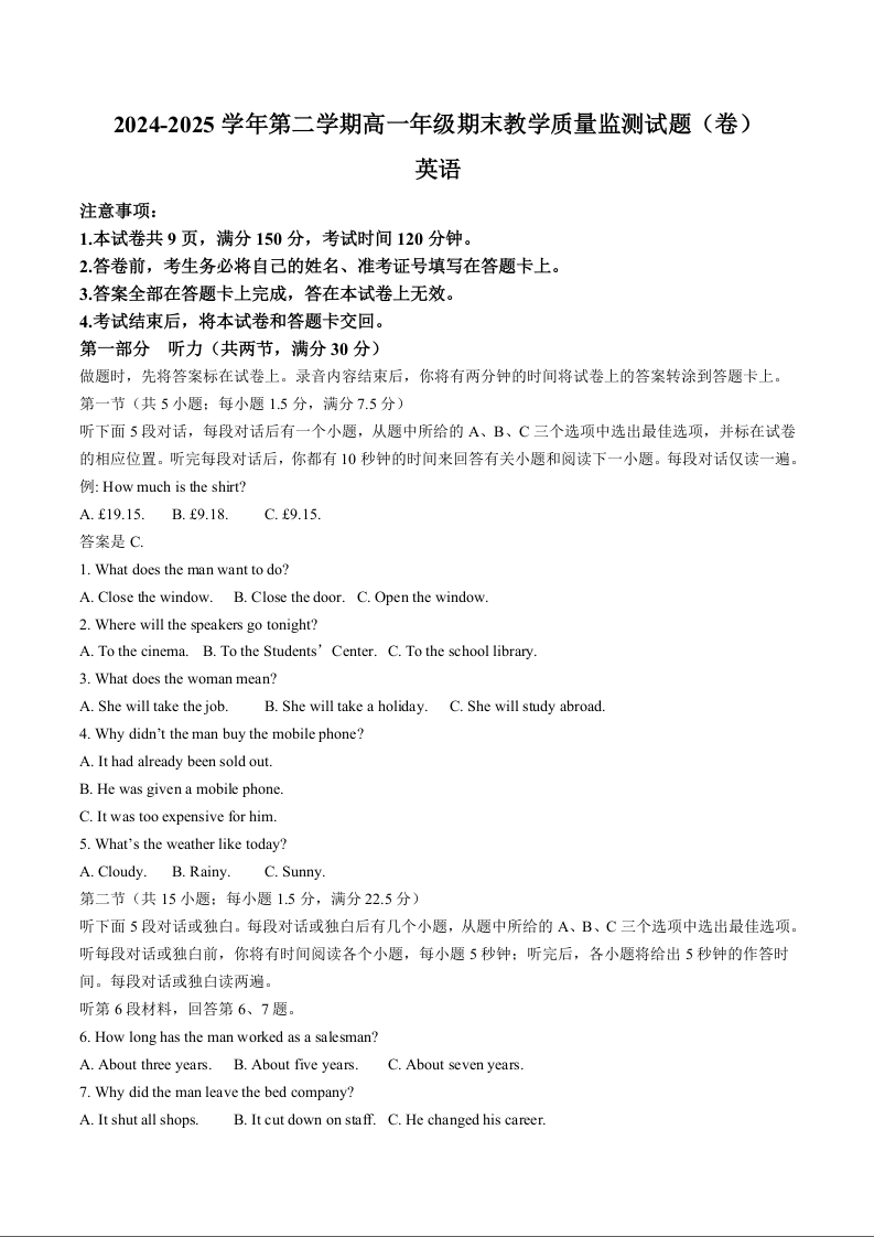 高一英语--山西省大同市2024-2025学年高一下学期期末考试