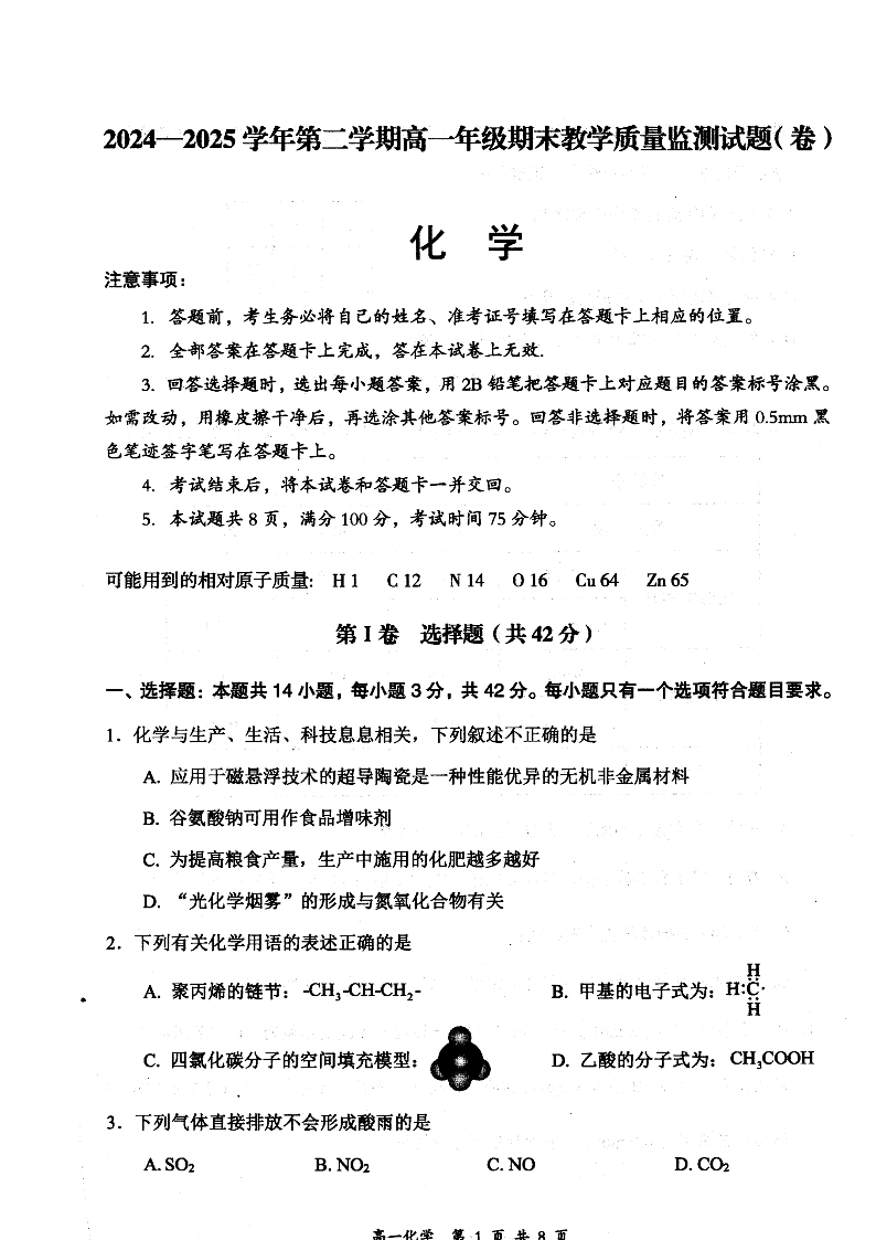 高一化学+答案--山西省大同市2024-2025学年高一下学期期末考试
