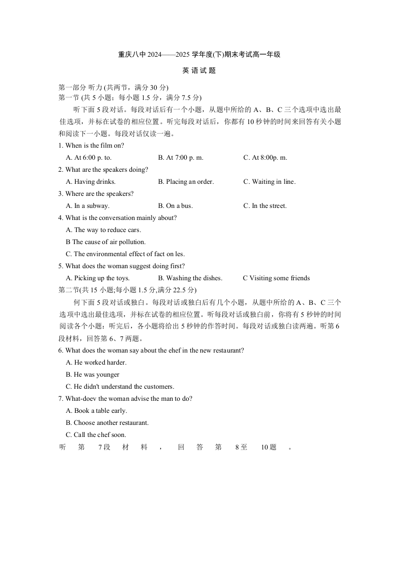 高一英语--重庆市第八中学校2024-2025学年高一下学期期末考试