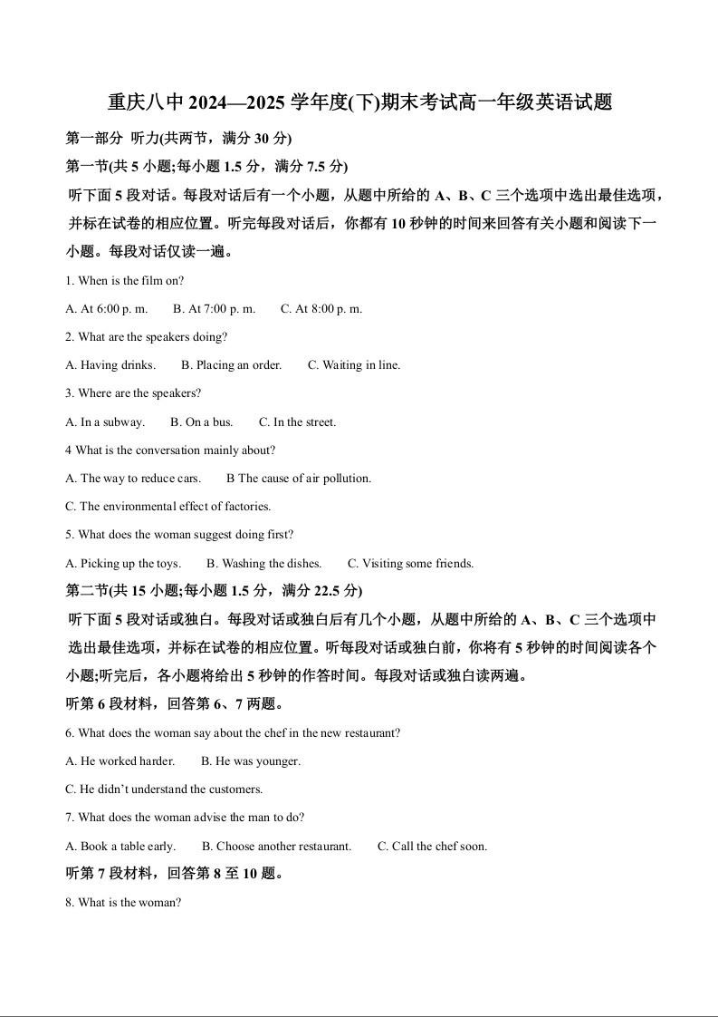 高一英语答案--重庆市第八中学校2024-2025学年高一下学期期末考试