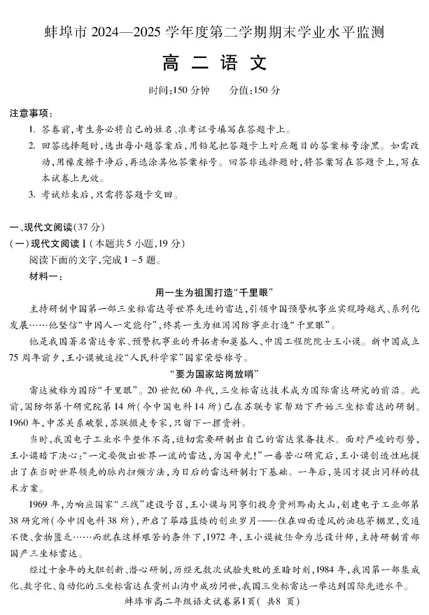 高二语文+答案--安徽省蚌埠市2024-2025年高二下学期期末考试