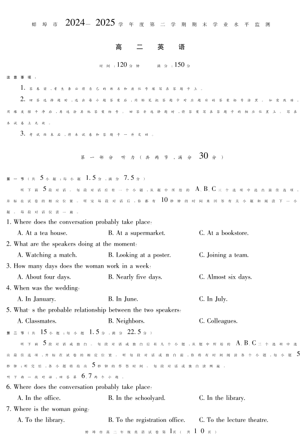 高二英语+答案--安徽省蚌埠市2024-2025年高二下学期期末考试