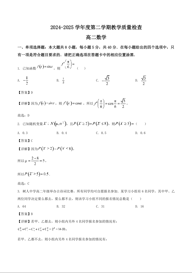 高二数学+答案--广东省东莞市2024-2025学年高二下学期期末考试