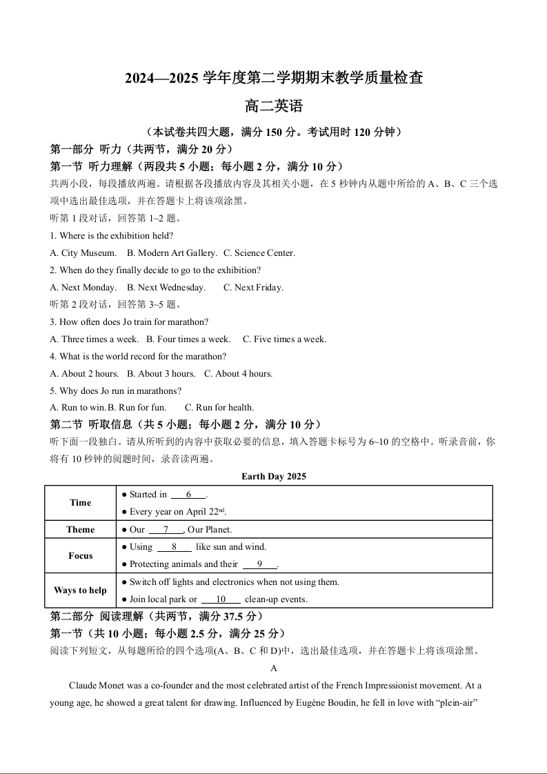 高二英语+答案--广东省东莞市2024-2025学年高二下学期期末考试