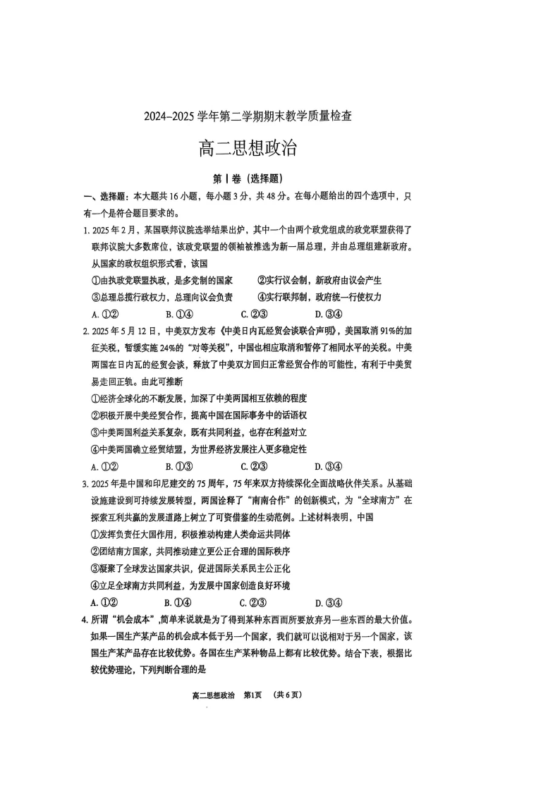 高二政治+答案--广东省东莞市2024-2025学年高二下学期期末考试