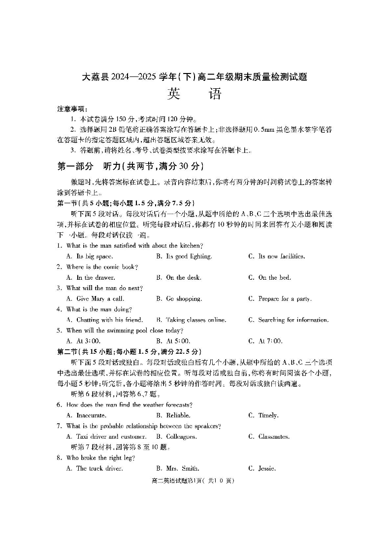 高二英语+答案--陕西省渭南市大荔县2024-2025学年高二下学期期末