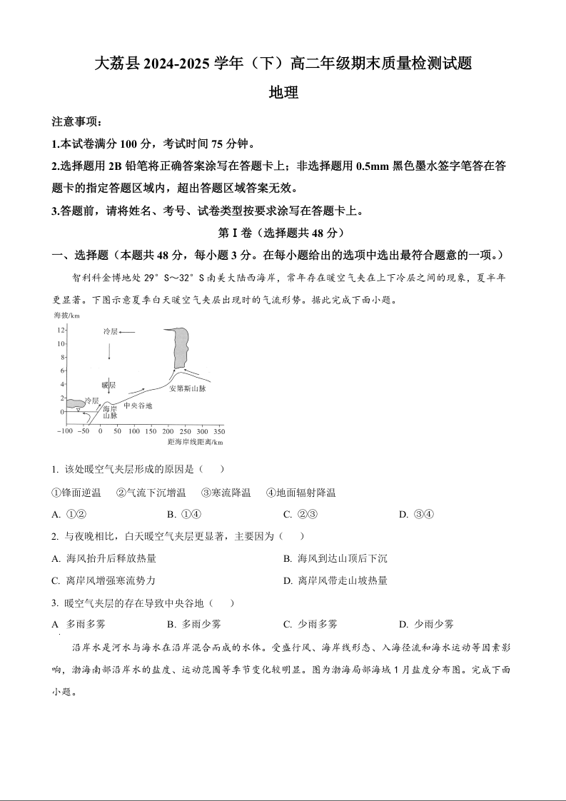 高二地理+答案--陕西省渭南市大荔县2024-2025学年高二下学期期末