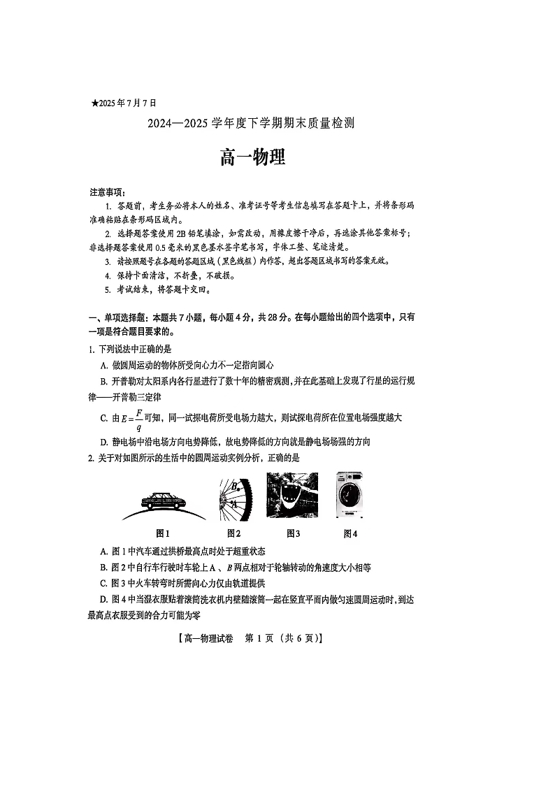 高一物理+答案--河南省三门峡市2024-2025学年高一下学期期末考试