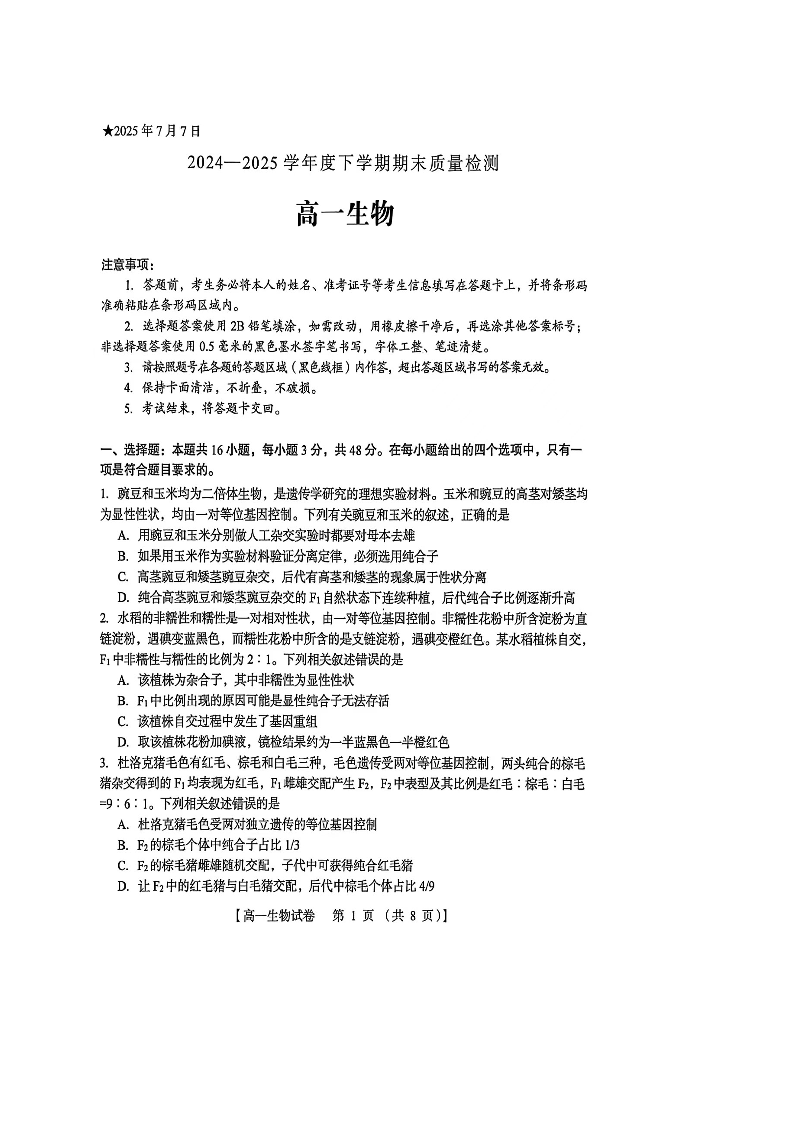 高一生物+答案--河南省三门峡市2024-2025学年高一下学期期末考试