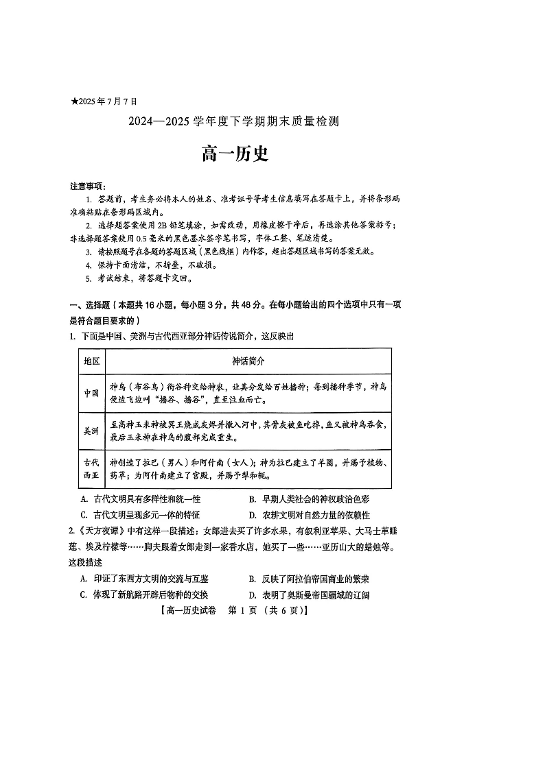 高一历史+答案--河南省三门峡市2024-2025学年高一下学期期末考试