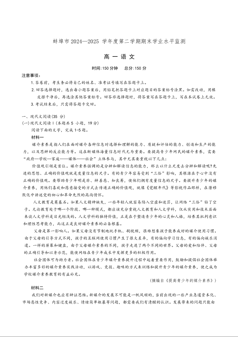 高一语文--安徽省蚌埠市2024-2025年高一下学期期末考试
