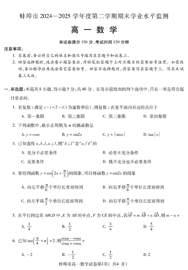 高一数学--安徽省蚌埠市2024-2025年高一下学期期末考试