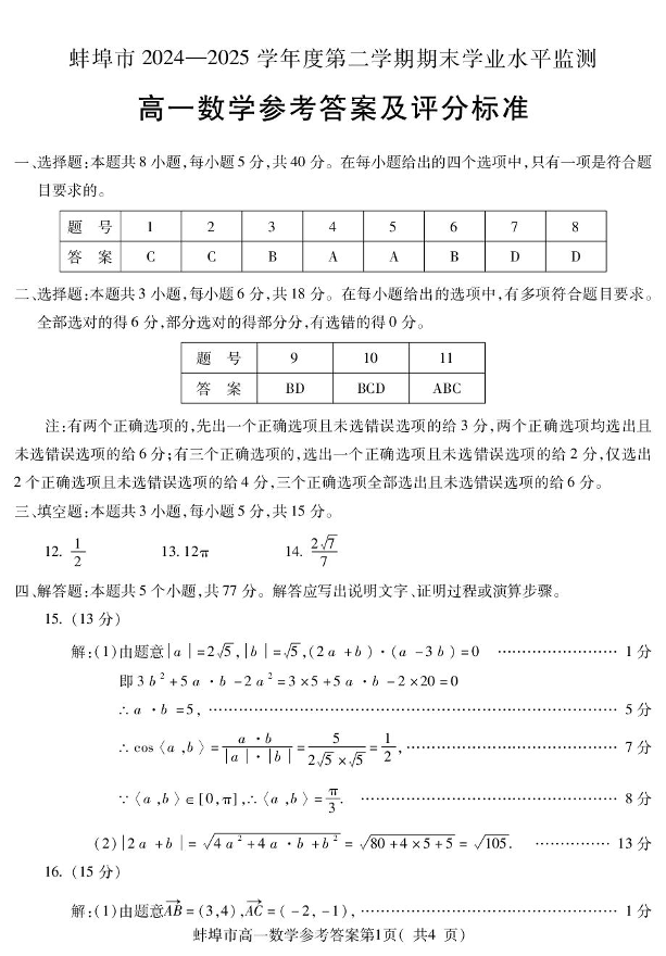 高一数学答案--安徽省蚌埠市2024-2025年高一下学期期末考试