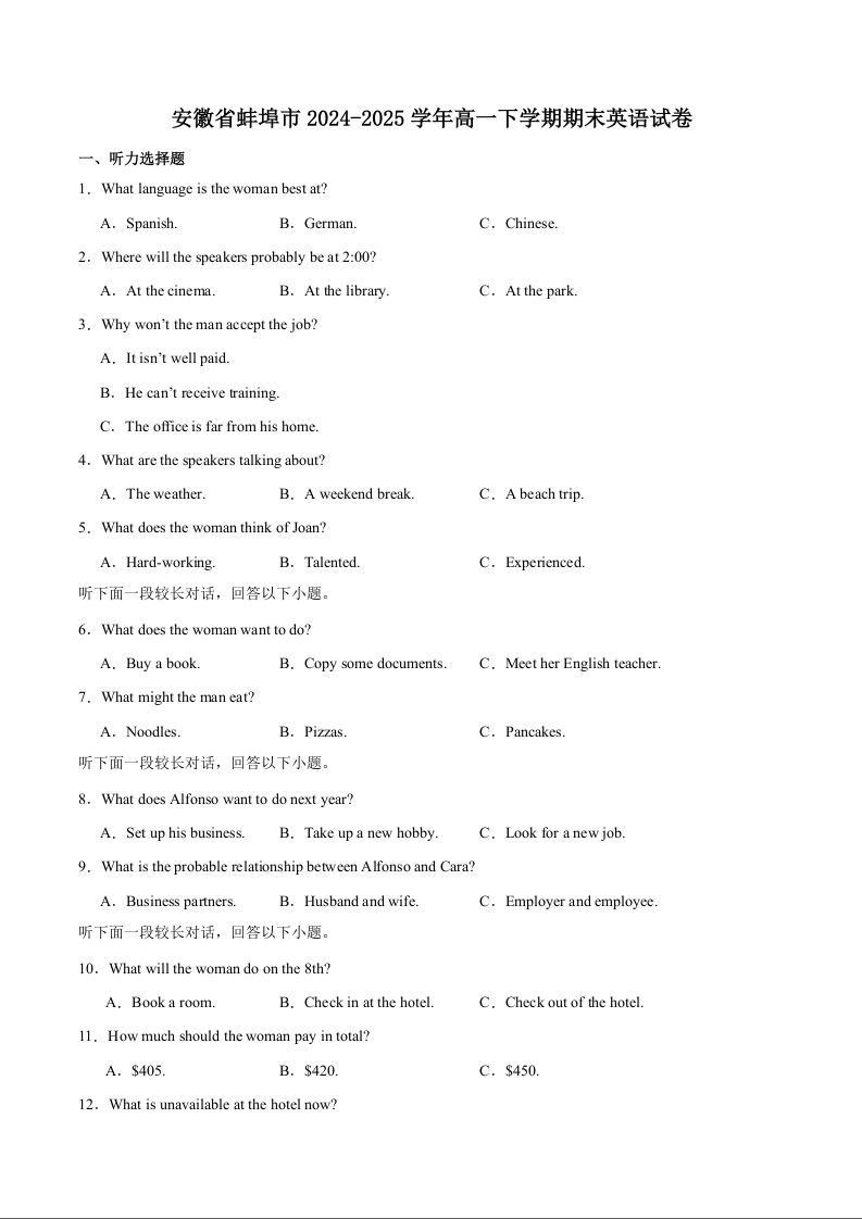 高一英语+答案--安徽省蚌埠市2024-2025年高一下学期期末考试