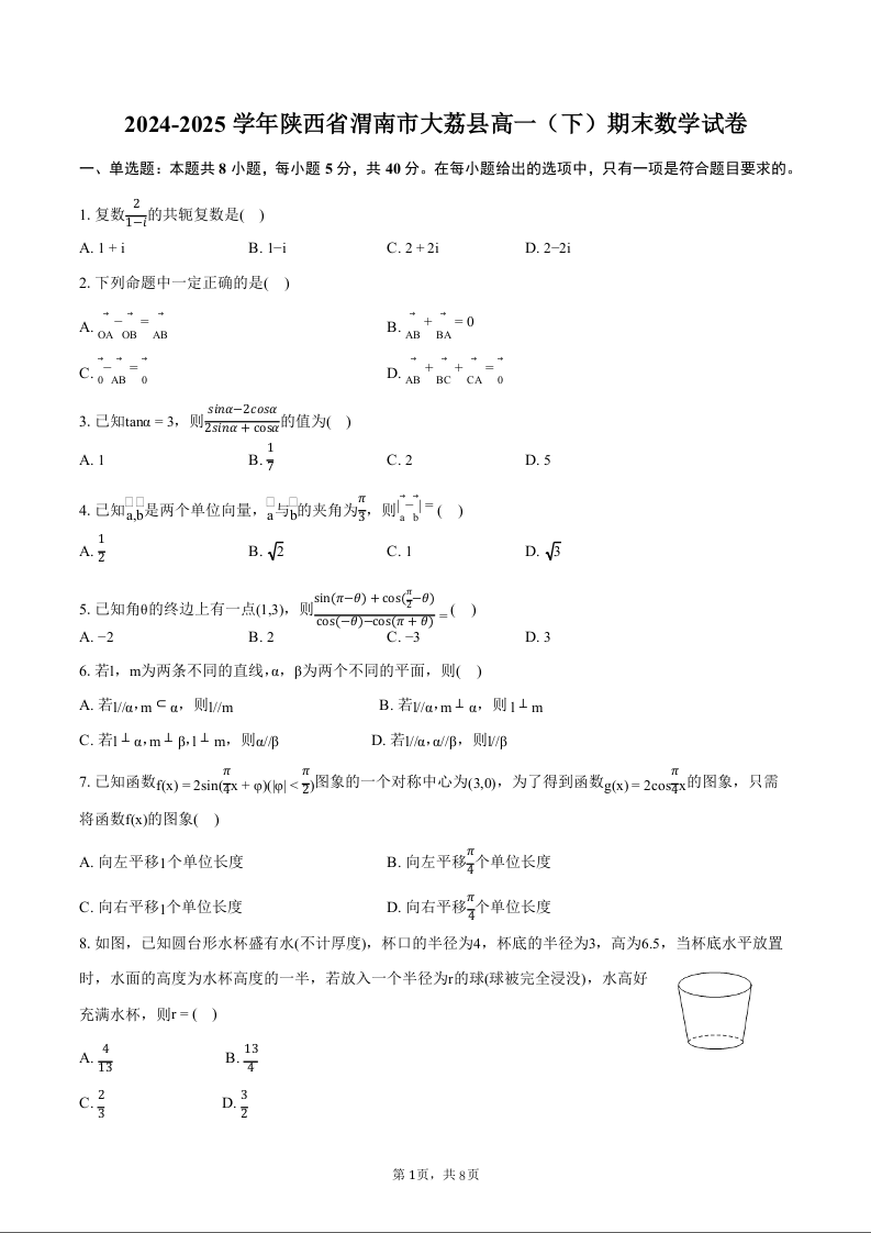 高一数学+答案--陕西省渭南市大荔县2024-2025学年高一下学期期末