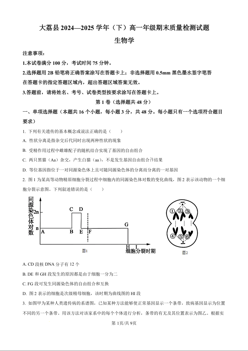 高一生物(原卷版)--陕西省渭南市大荔县2024-2025学年高一下学期期末