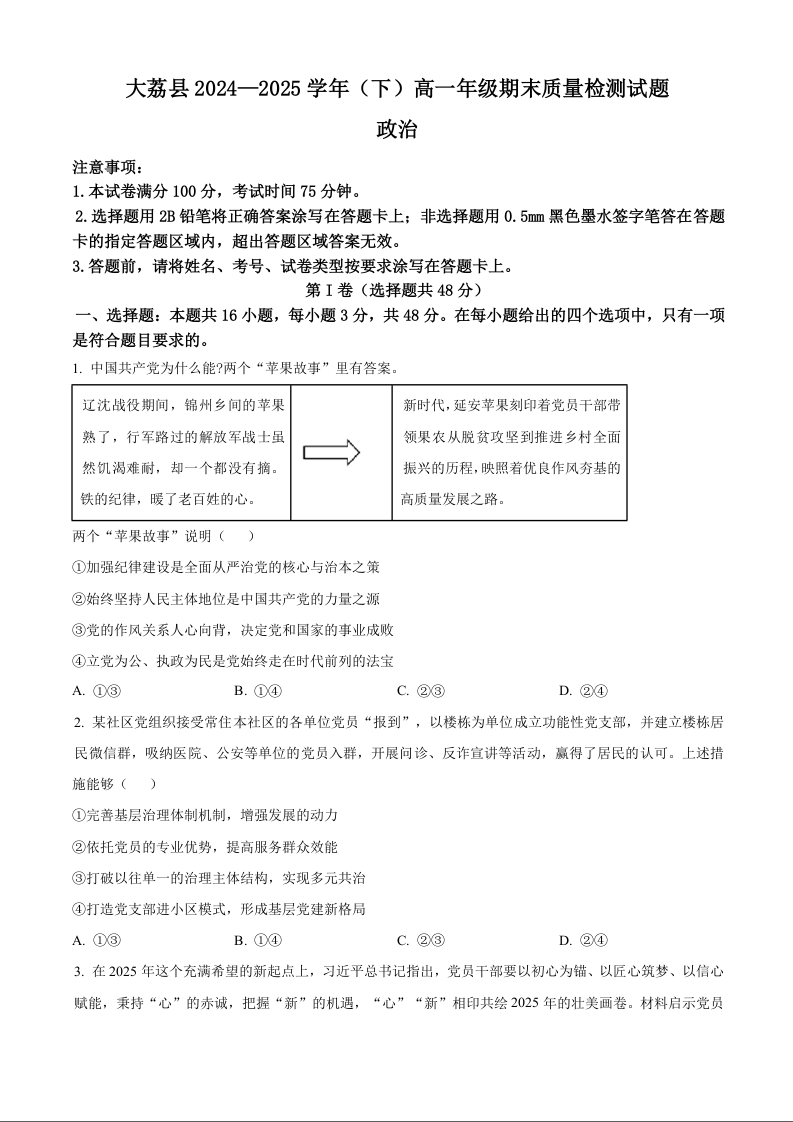 高一政治+答案--陕西省渭南市大荔县2024-2025学年高一下学期期末