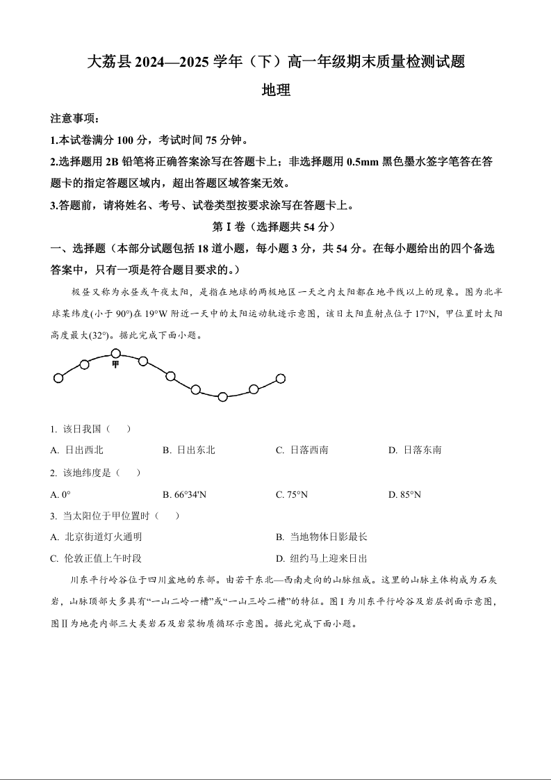 高一地理+答案--陕西省渭南市大荔县2024-2025学年高一下学期期末