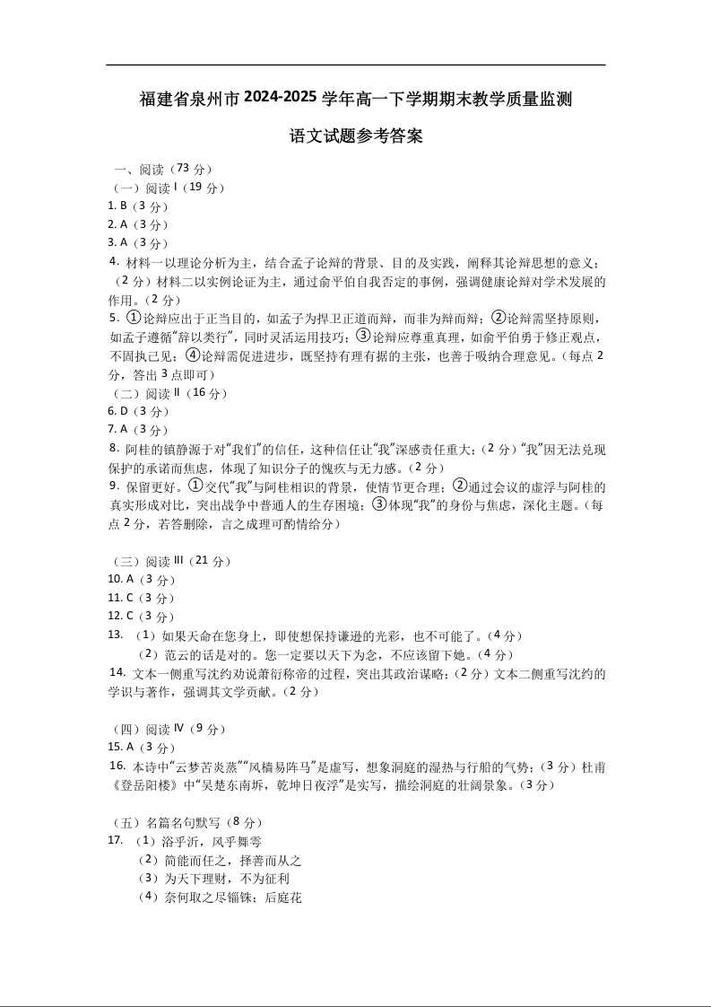 高一语文答案--福建省泉州市2024-2025学年高一下学期7月期末考试