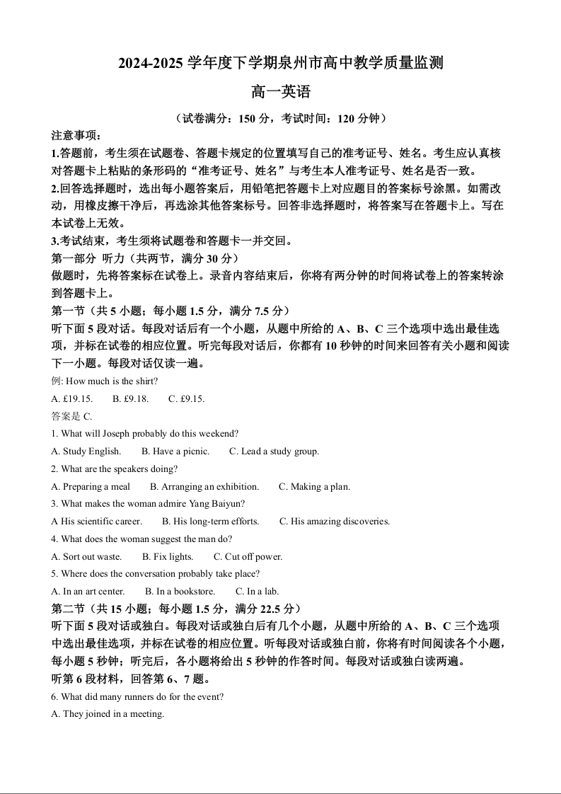 高一英语+答案--福建省泉州市2024-2025学年高一下学期7月期末考试