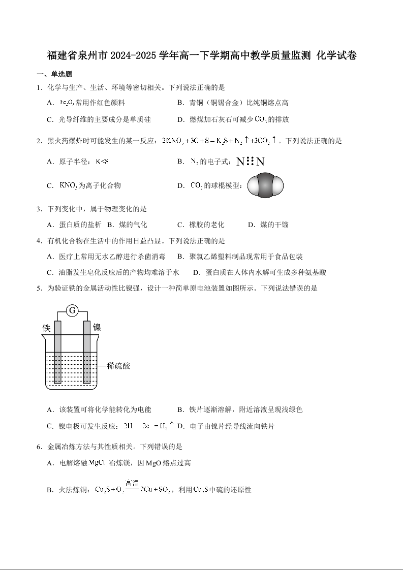 高一化学+答案--福建省泉州市2024-2025学年高一下学期7月期末考试