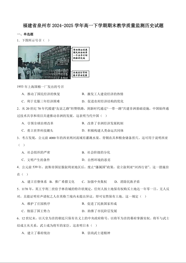 高一历史+答案--福建省泉州市2024-2025学年高一下学期7月期末考试