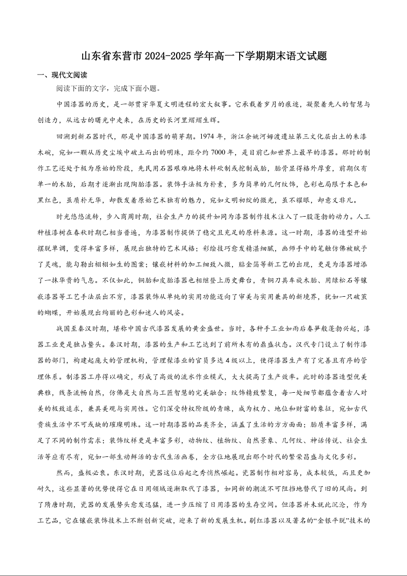 高一语文+答案--山东省东营市2024-2025学年高一下学期期末考试